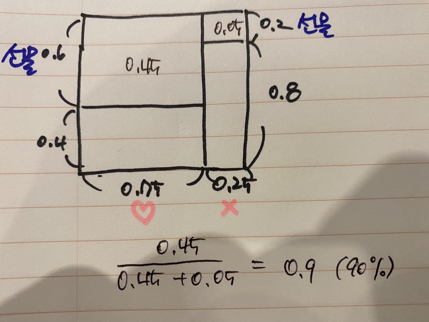 이렇게 사전 확률(나를 좋아할 확률)을 추가되는 정보들을 통해서 계속해서 갱신할 수 있는것이 베이즈 정리의 가장 큰 의미이다.