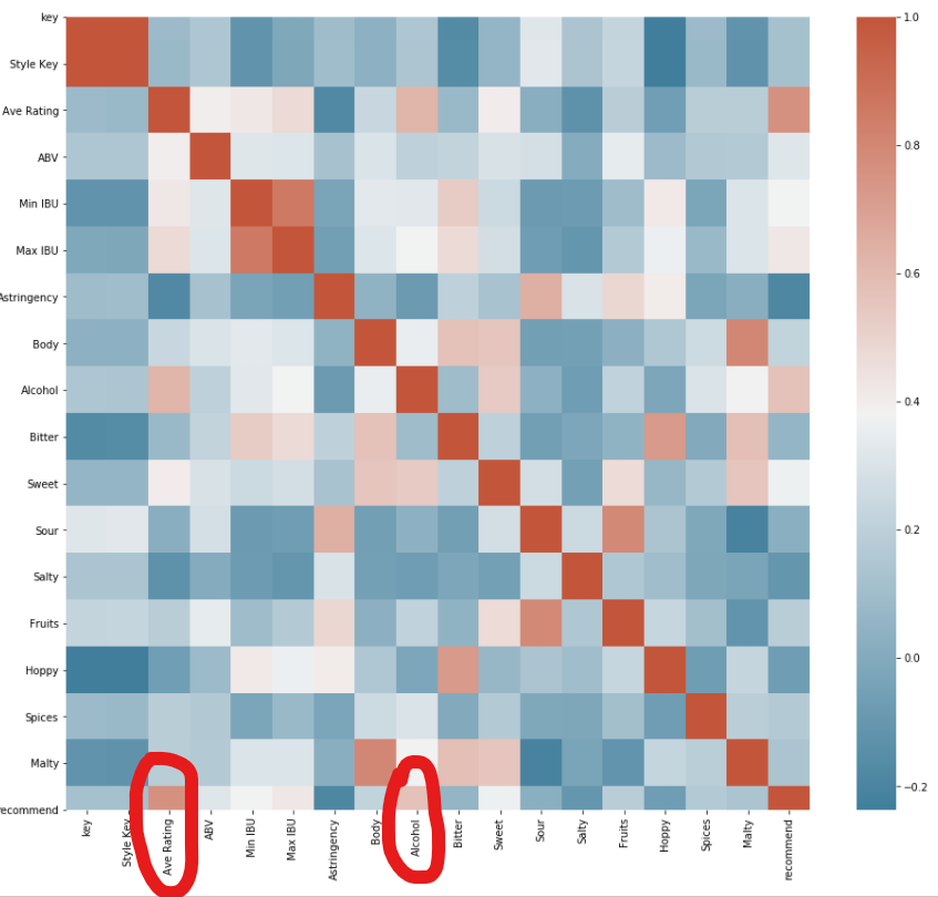 타겟값인 recommend와 가장 큰 상관관계를 보이는 칼럼은 Ave Rating을 제외하고 Alcohol인 것을 확인할 수 있습니다.
