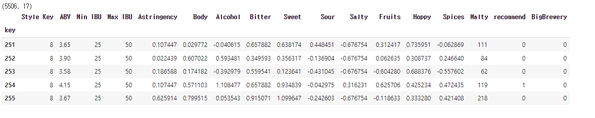 총 5500개 정도의 데이터와 21개의 피처를 가지고 있는 맥주데이터 입니다.