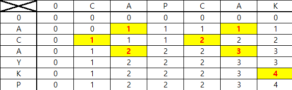 (4,6)셀 : CAPC와 AC에서 A가 공통적으로 추가되어 CAPCA, ACA로 LCS 는 ACA가 된다.